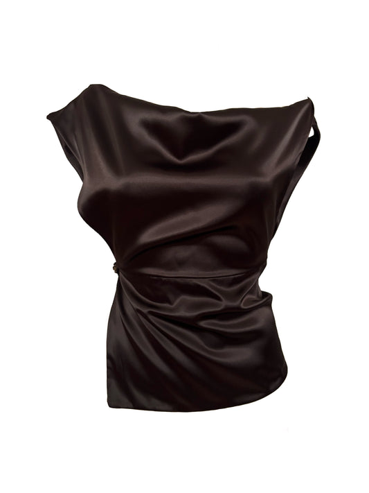 Asymmetrical Draped Double Layered Satin Shirt With Button - Brown
